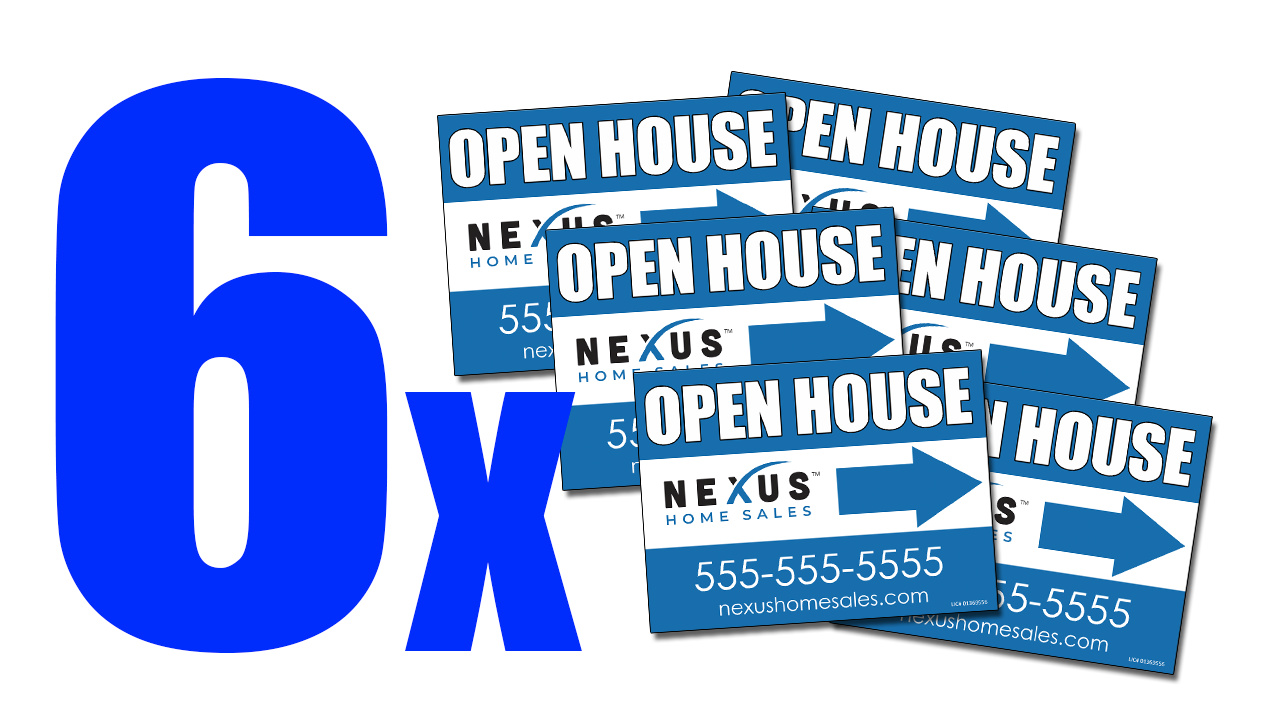 Get the attention your home deserves on Open House Day! These six signs are customized with your own phone number to help drive buyers to you home. Made of durable corrugated UV-resistant vinyl and printed front and back, these are perfect for placement around your neighborhood. Wire stakes included. FREE SHIPPING to the address you provide in this order. If you would like to have your signs shipped elsewhere, please let us know.